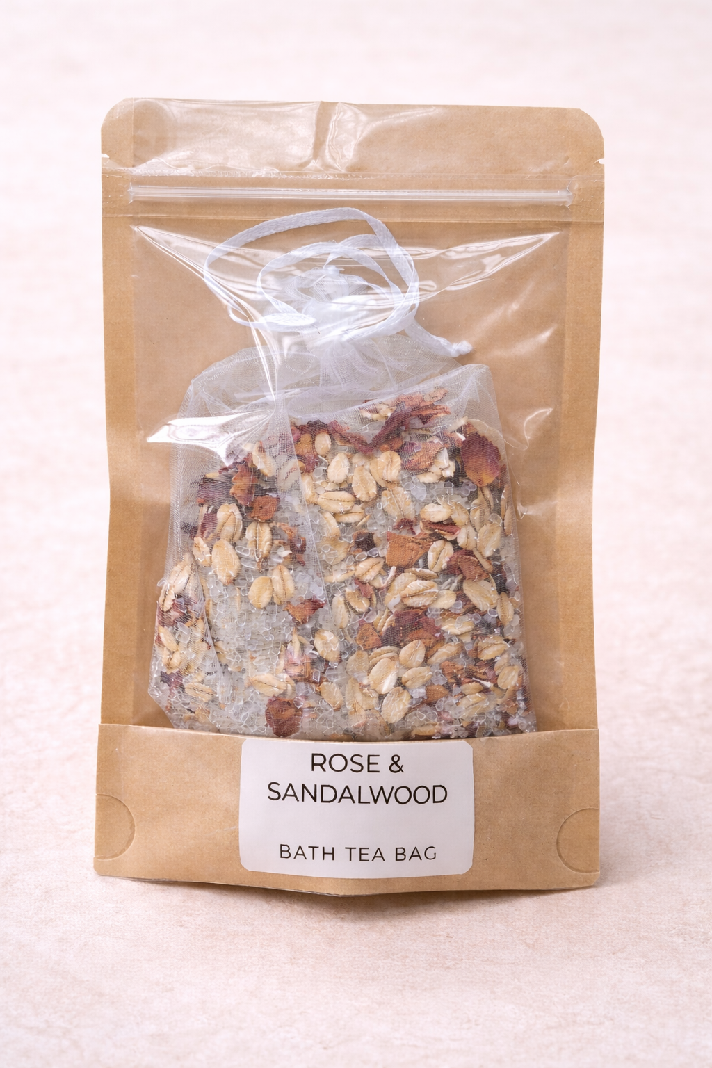 Soothe and unwind with this luxurious bath tea bag, filled with rolled oats, Epsom salts, and delicate rose petals. Infused with rose oil and warm sandalwood essential oil, it slowly releases skin-softening, calming benefits as it steeps in warm water.